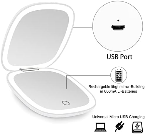 *Rechargeable Lighted Makeup Mirror* Building in 600mA rechargeable Li-Battery. It is around 1 hour lihgting work in full charging. You can light up with mircro cable too. It is convenience to charge the mirror with 5V/1A-2A charger, power bank or notebook etc.